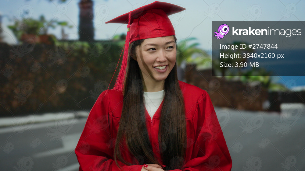 Young asian woman in red graduation gown smiling outdoors on urban street in city background