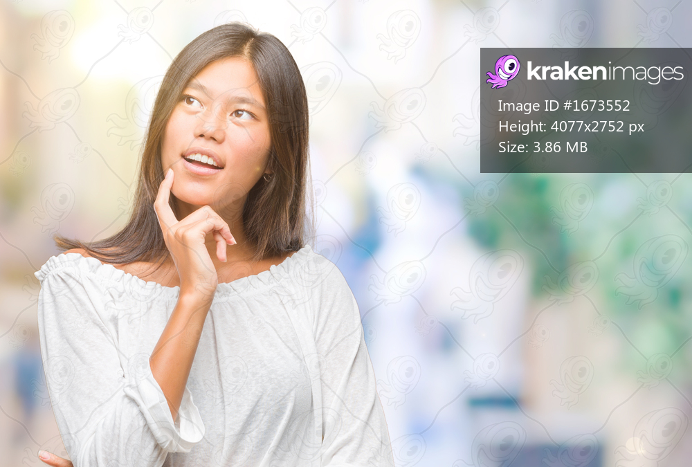 Young asian woman over isolated background with hand on chin thinking about question, pensive expression. Smiling with thoughtful face. Doubt concept.
