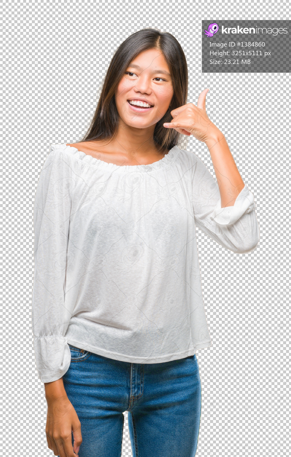 Young asian woman over isolated background smiling doing phone gesture with hand and fingers like talking on the telephone. Communicating concepts.