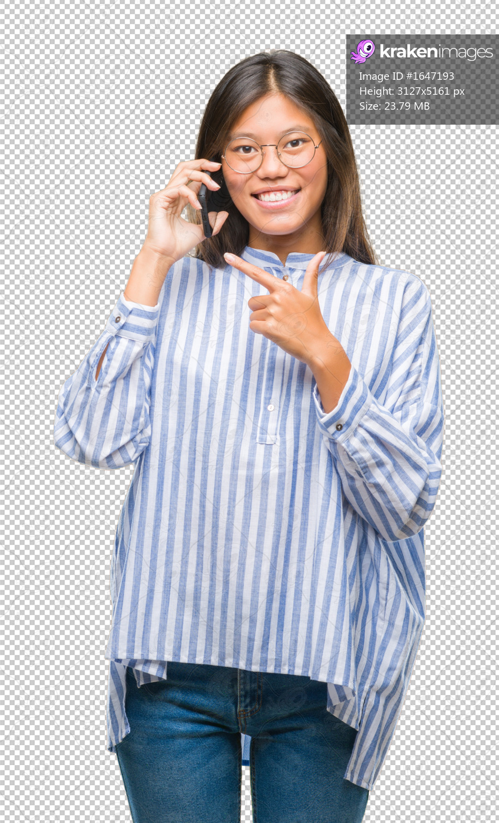 Young asian woman speaking on the phone over isolated background very happy pointing with hand and finger