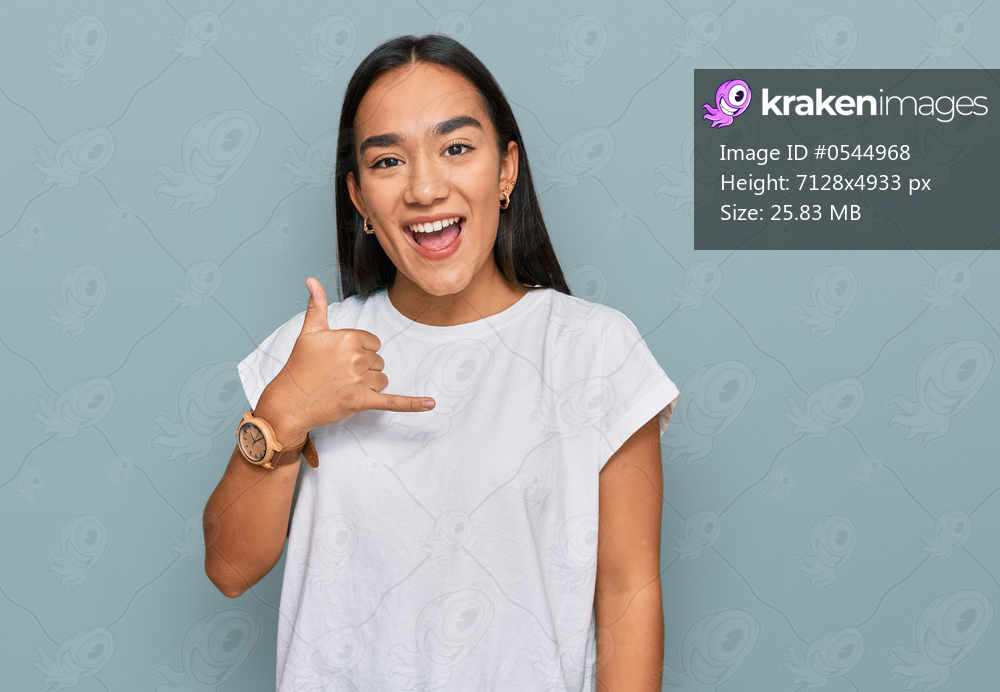 Young asian woman wearing casual white t shirt smiling doing phone gesture with hand and fingers like talking on the telephone. communicating concepts. - Kraken Images