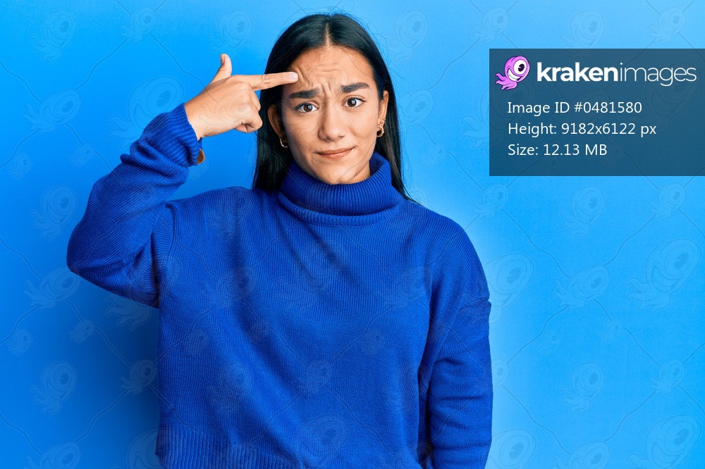 Young asian woman wearing casual winter sweater pointing unhappy to pimple on forehead, ugly infection of blackhead. acne and skin problem