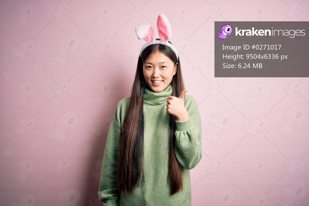 Young asian woman wearing cute easter bunny ears over pink background doing happy thumbs up gesture with hand. Approving expression looking at the camera showing success. - Kraken Images