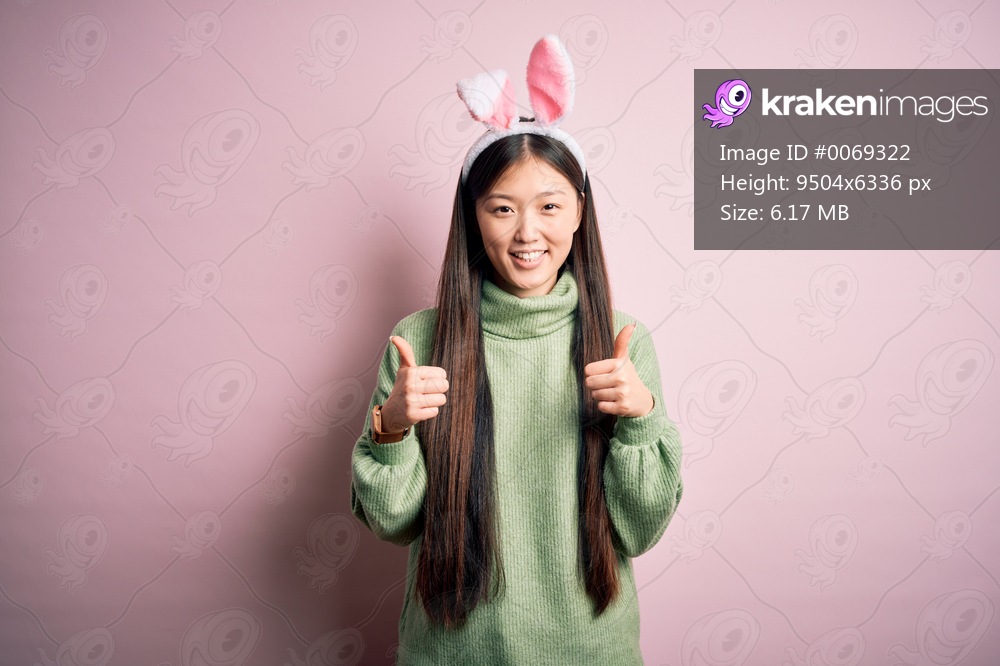 Young asian woman wearing cute easter bunny ears over pink background success sign doing positive gesture with hand, thumbs up smiling and happy. Cheerful expression and winner gesture. - Kraken Images