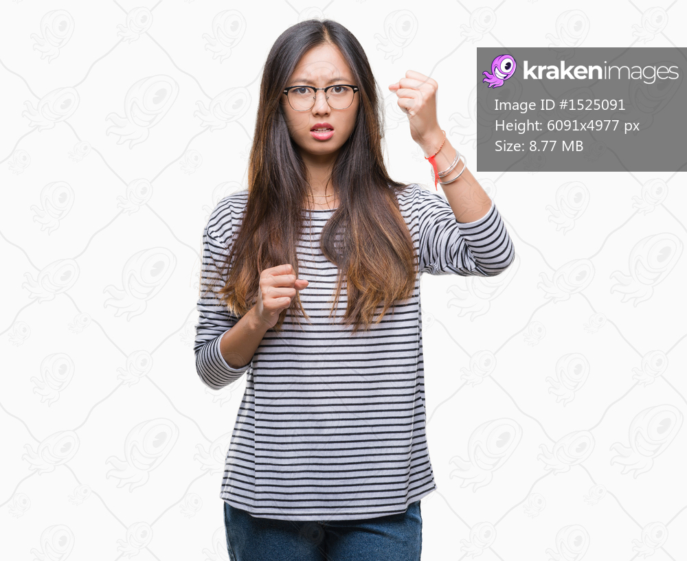 Young asian woman wearing glasses over isolated background angry and mad raising fist frustrated and furious while shouting with anger. Rage and aggressive concept. - Kraken Images