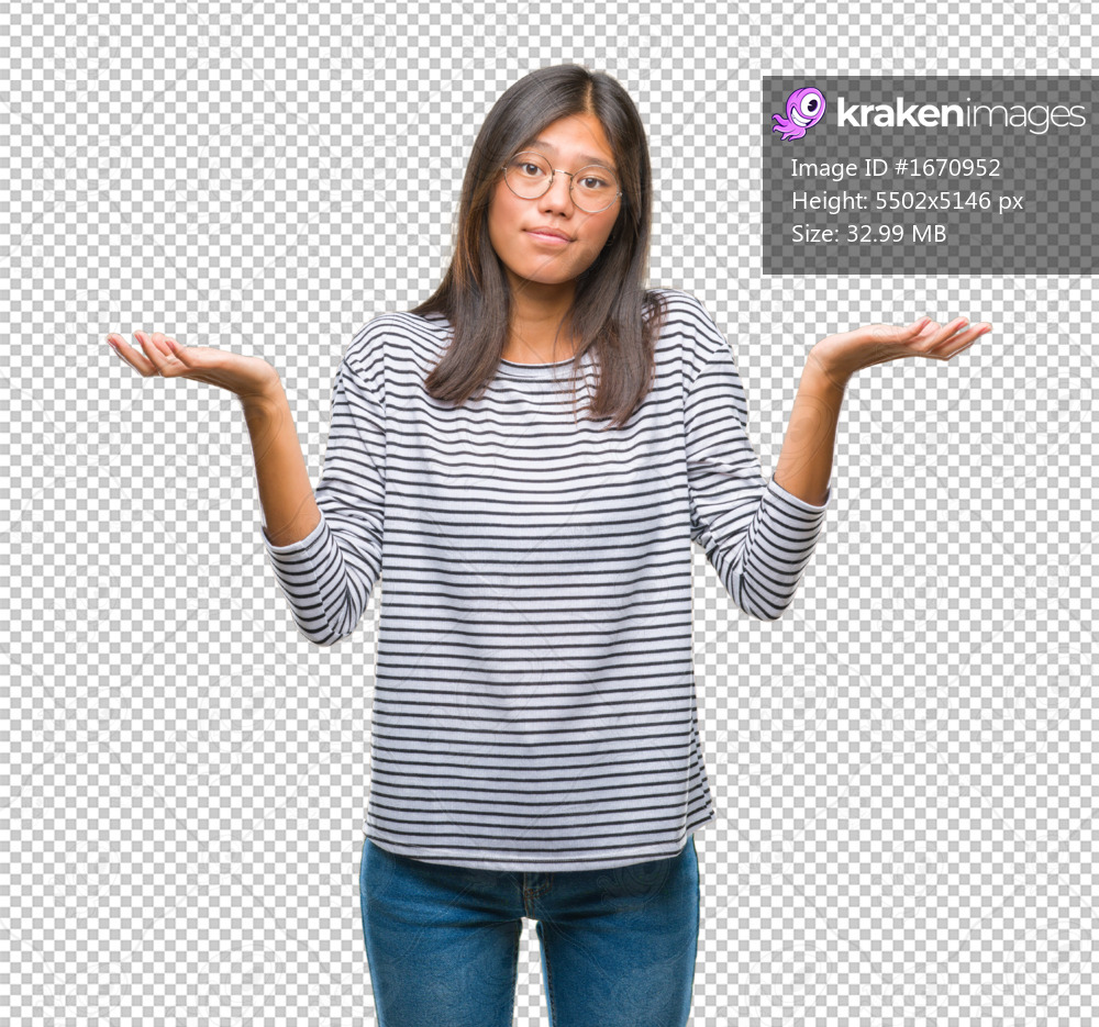 Young asian woman wearing glasses over isolated background clueless and confused expression with arms and hands raised. Doubt concept.