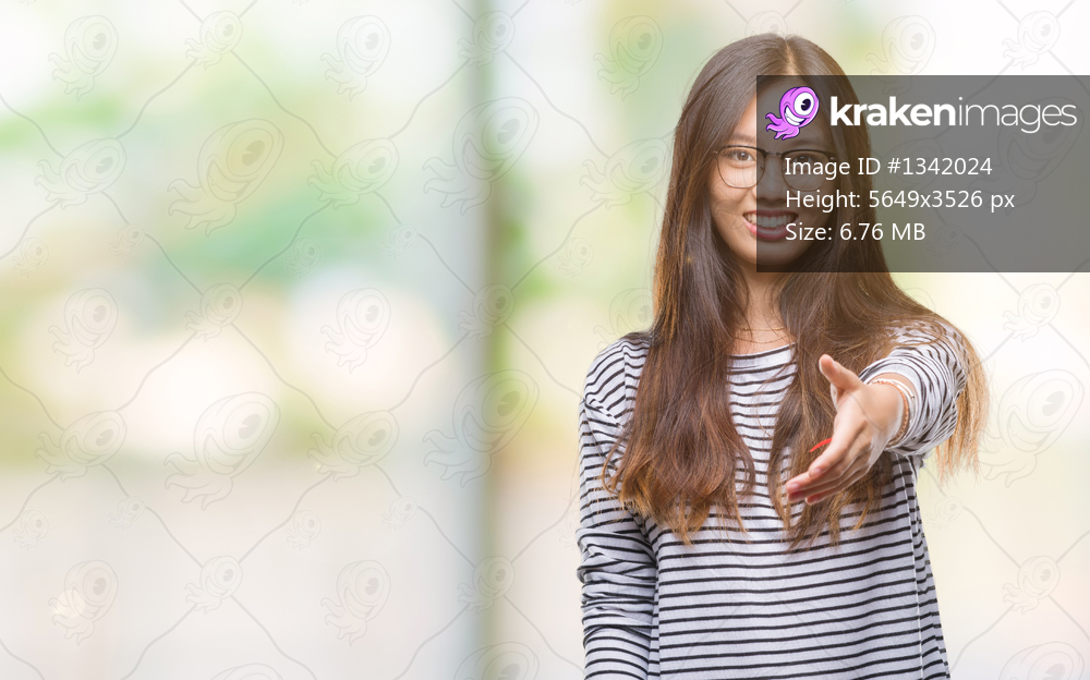 Young asian woman wearing glasses over isolated background smiling friendly offering handshake as greeting and welcoming. Successful business.