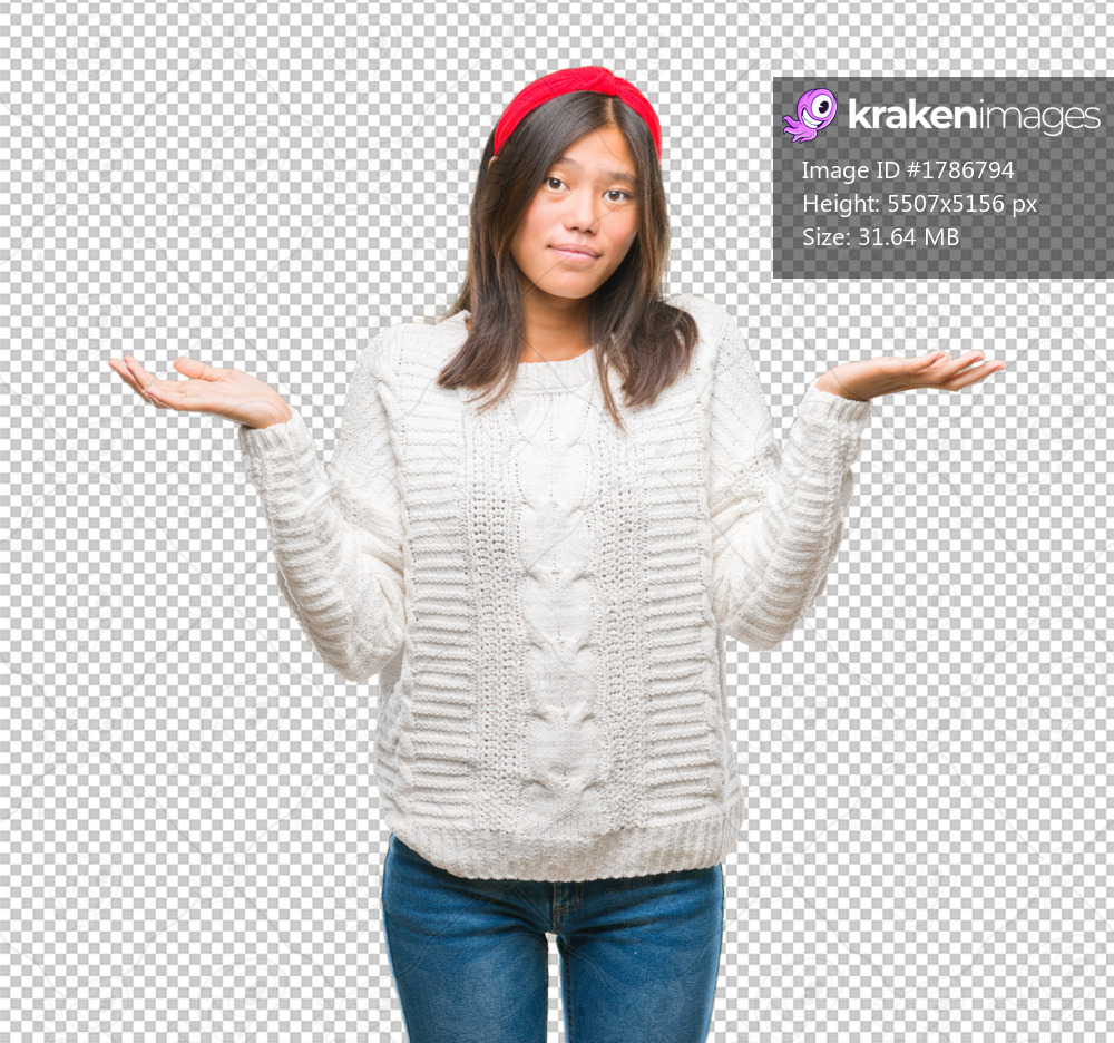 Young asian woman wearing winter sweater over isolated background clueless and confused expression with arms and hands raised. Doubt concept.