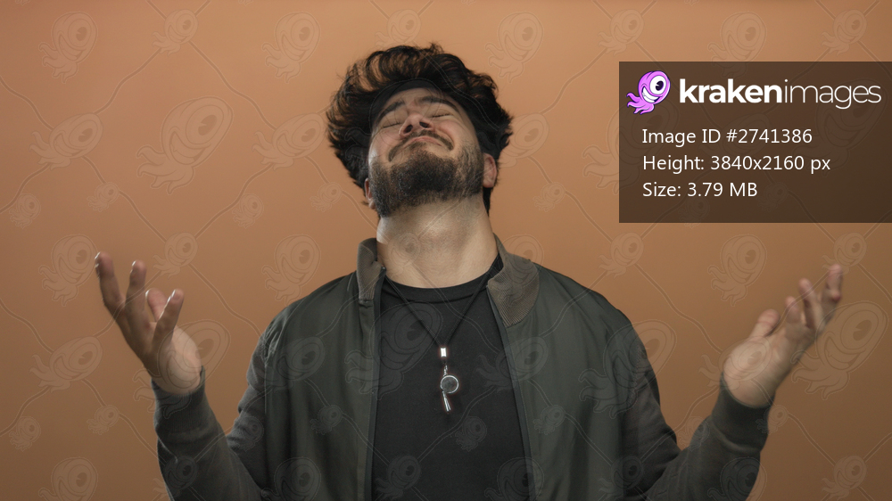 Young bearded hispanic man looking concerned with outstretched hands against an orange background, expressing confusion and emotion.