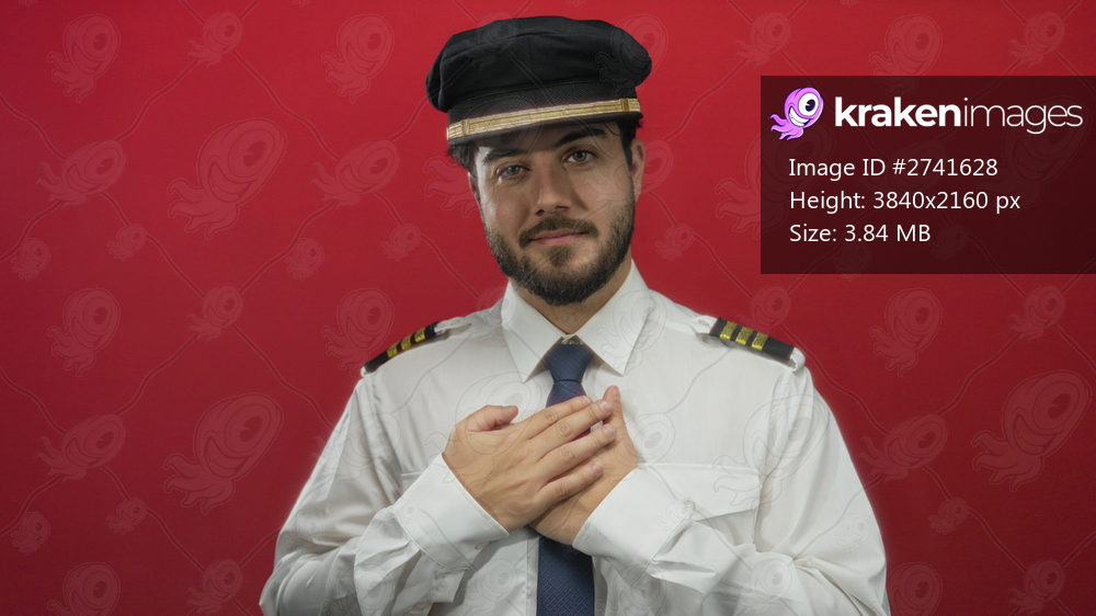 Young bearded hispanic man wearing a pilot uniform places his hands on his chest against a bold red background, expressing emotion and professionalism. - Kraken Images