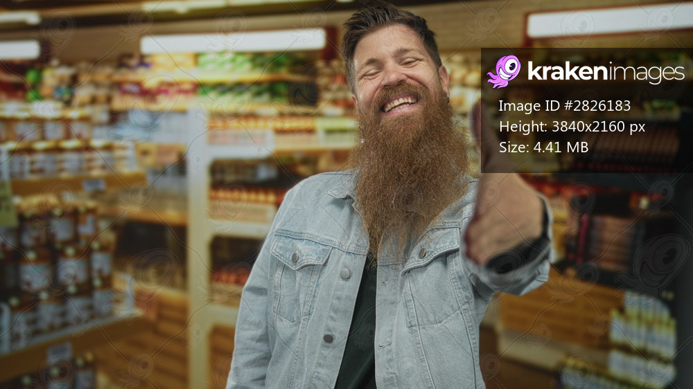 Young bearded man extends hand for handshake in supermarket aisle stocked with groceries; friendliness connection.
