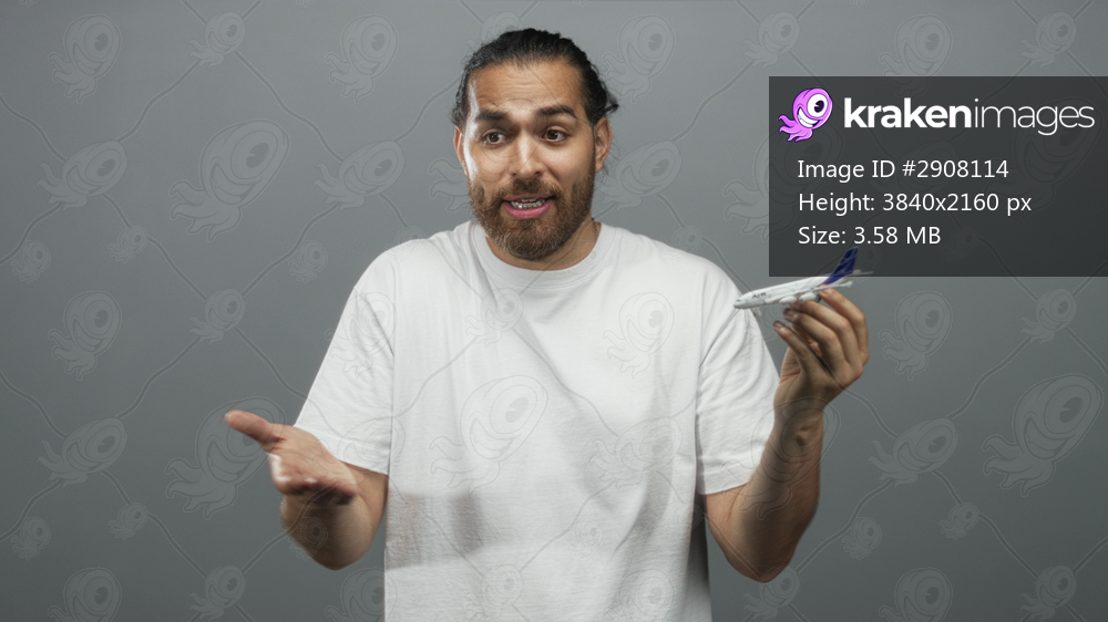 Young bearded man holding a white model airplane with open palm and expressive face in gray studio; curiosity travel planning.