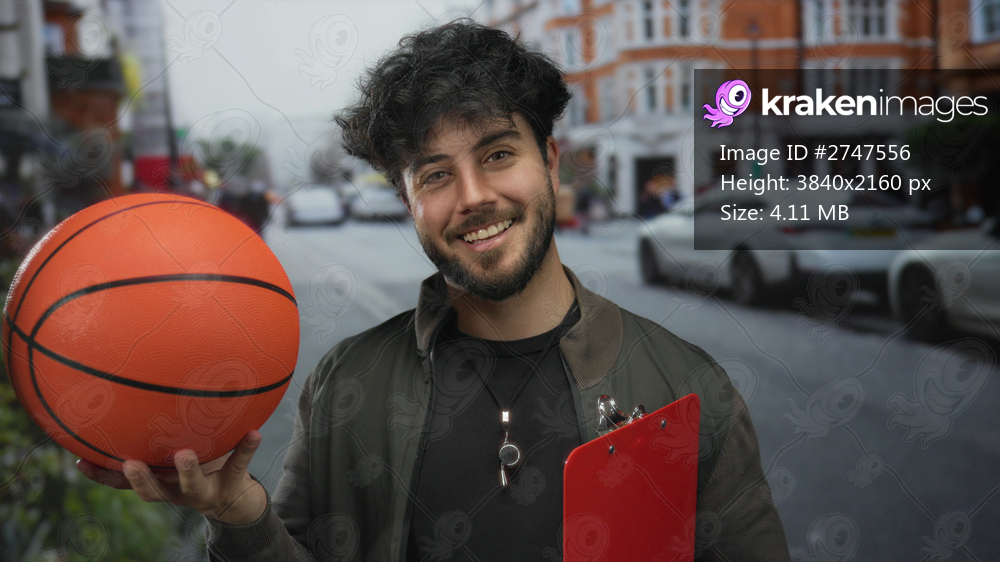Young bearded man holding basketball and clipboard on busy street smiles enthusiastically at camera exhibiting casual urban lifestyle