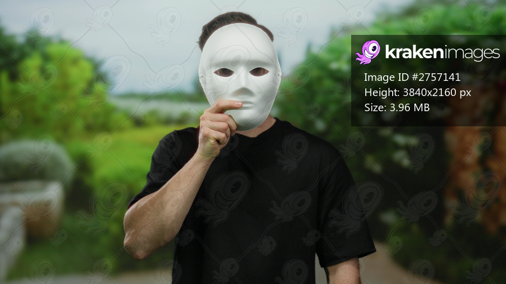 Young bearded man holding white mask in outdoor park setting with lush green trees visible in background creating an atmosphere of mystery and curiosity as he unveils his face to the camera - Kraken Images
