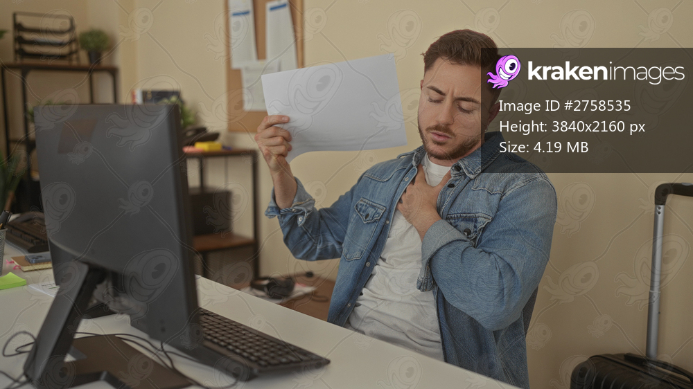 Young bearded man in a denim jacket sitting at a desk in an office, fanning himself with documents, looking stressed at his computer screen next to a suitcase and corkboard. - Kraken Images