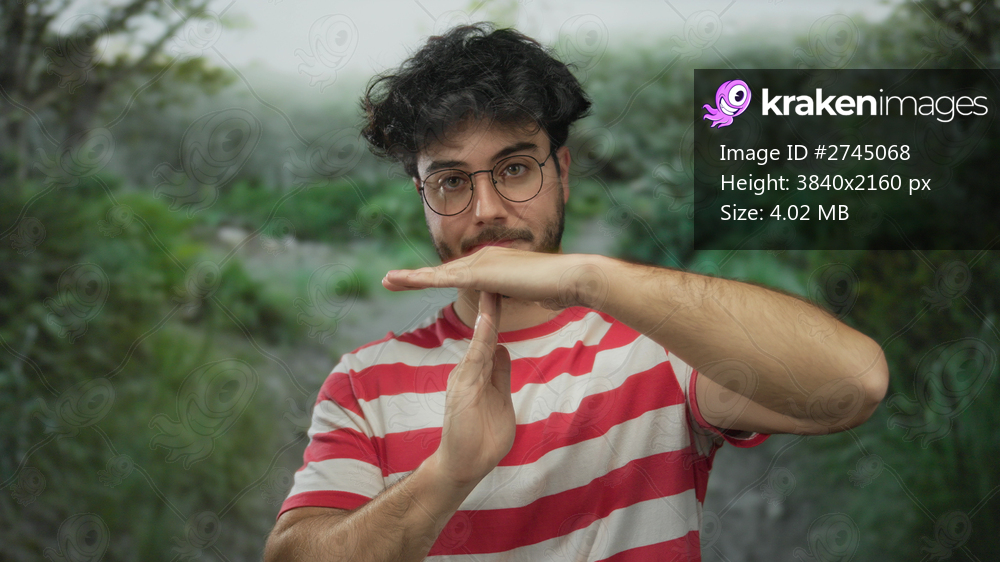 Young bearded man in a striped shirt making a timeout gesture in a lush green park setting outdoors.