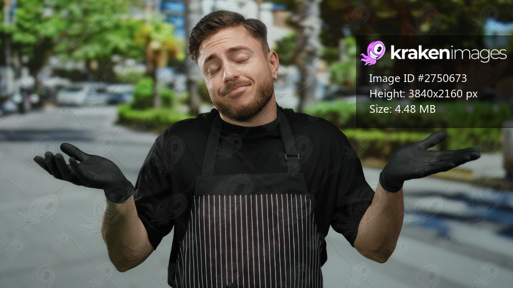 Young bearded man in apron with gloves shrugs on street with city background outdoor showcasing casual waiter theme
