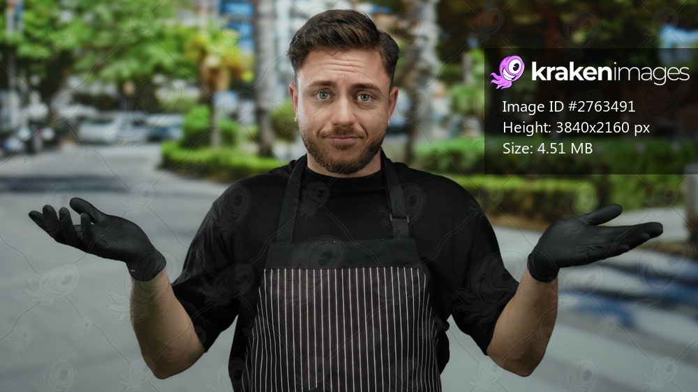 Young bearded man in apron with gloves shrugs on street with city background outdoor showcasing casual waiter theme