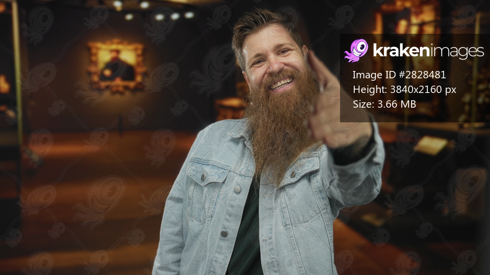Young bearded man in denim jacket extends hand for handshake in building lit gallery with artwork on walls; friendly welcome.