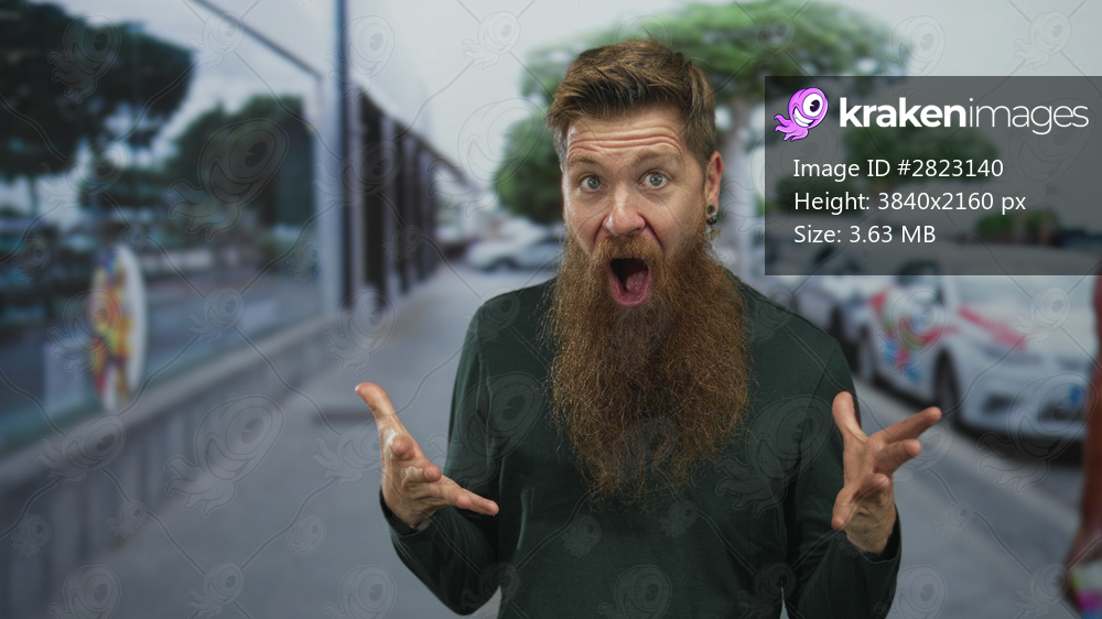 Young bearded man in green shirt on city street with mouth open and palms raised gesture; surprise astonishment.