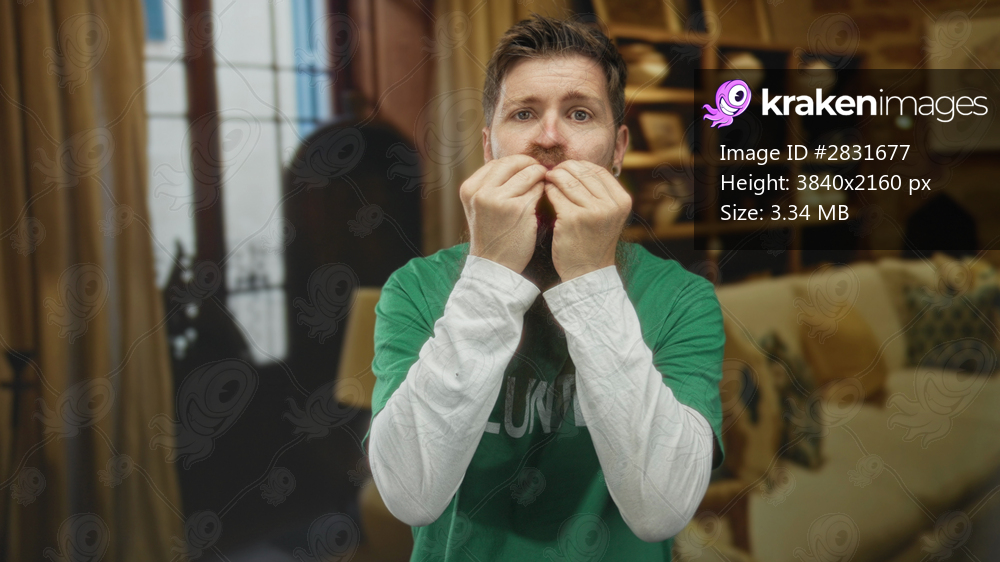 Young bearded man in green volunteer shirt softly blows kiss with hand in building; warmth and kindness.