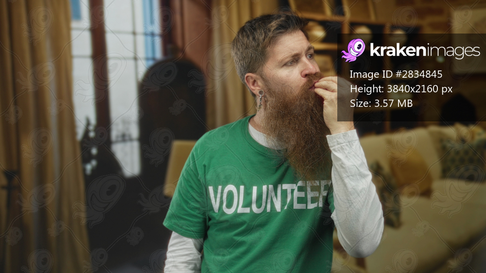 Young bearded man in green volunteer shirt softly blows kiss with hand in building; warmth and kindness.