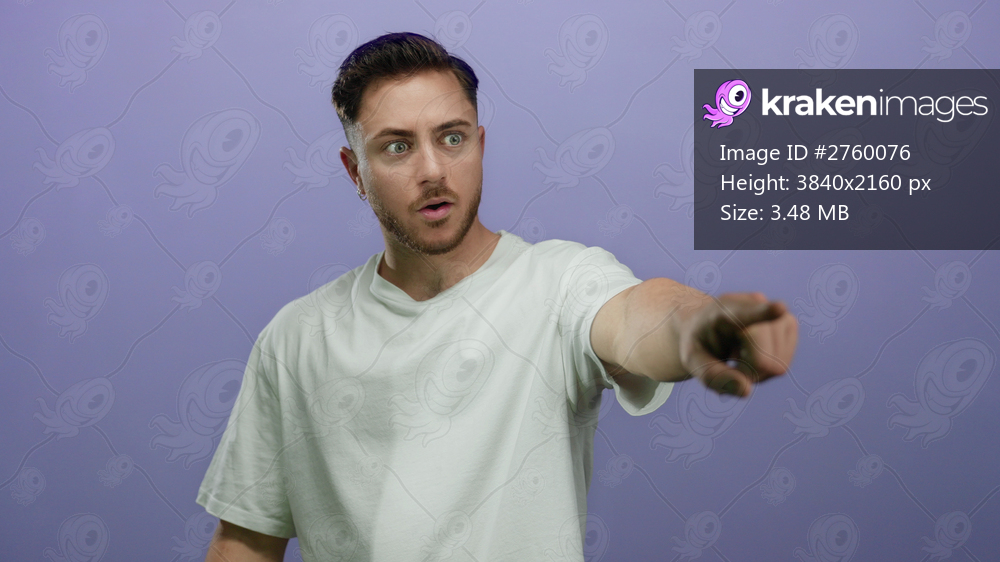 Young bearded man in white shirt pointing intensely against an isolated purple wall background, expressing focus and determination.