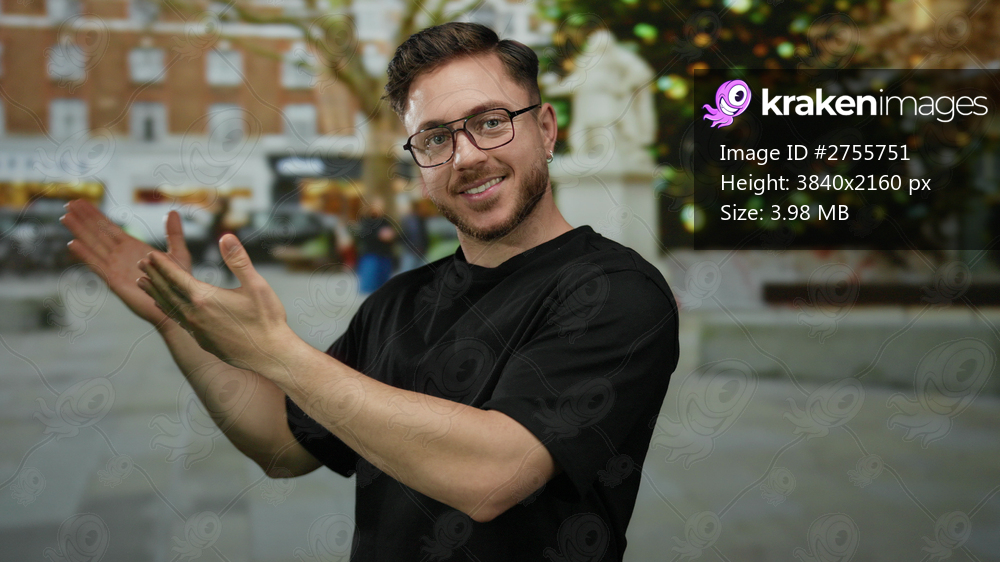 Young bearded man presenting with outstretched hands on a city street with blurred people and shops in the background, portraying an urban and inviting scenario. - Kraken Images