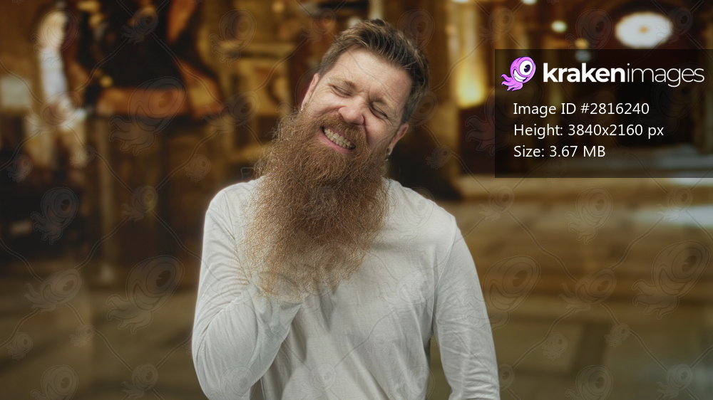 Young bearded man pressing his neck in pain with closed eyes inside a historic church building; discomfort.