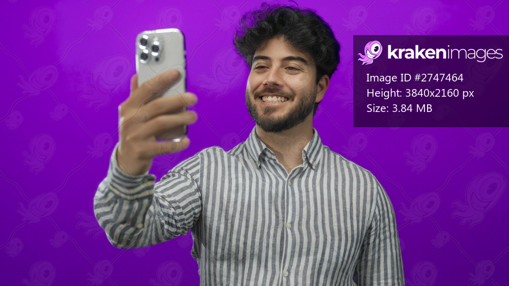 Young bearded man takes selfie with smartphone in front of vibrant purple background wearing striped shirt expressing joy and connection.