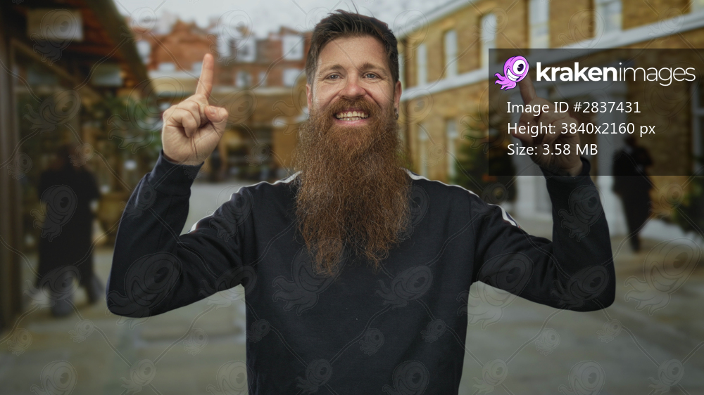 Young bearded man wearing black sweatshirt pointing index finger upward on busy city street lined with brick shops; hope optimism.