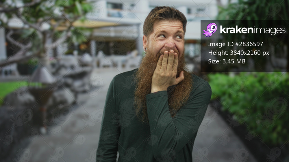 Young bearded man wearing dark green shirt covers mouth with hand while standing on city street; astonishment.