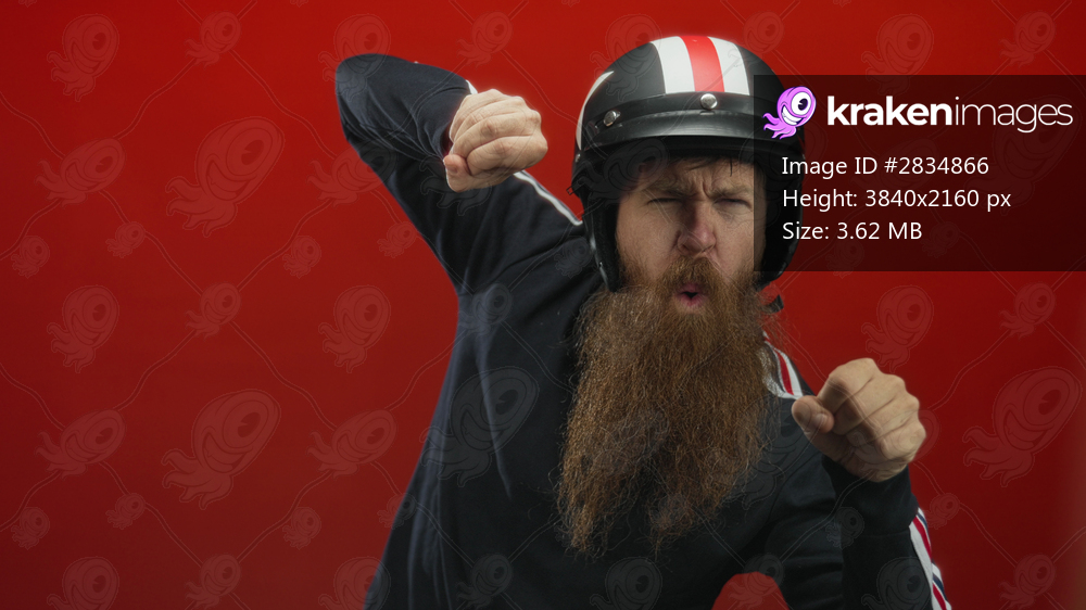 Young bearded man wearing helmet makes motorcycle riding gesture in red studio setting; excitement adventure.