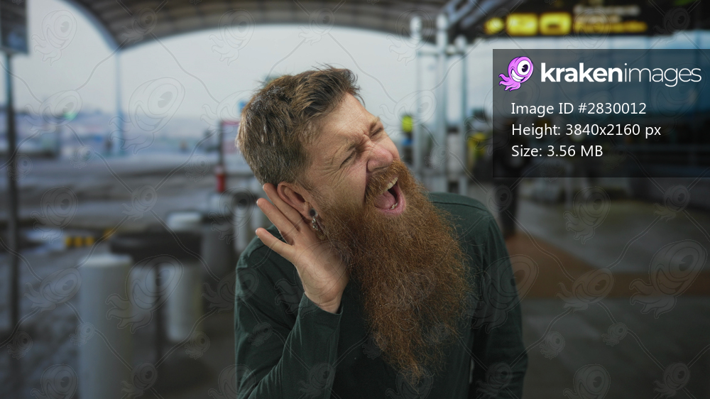 Young bearded man wearing silver hoop earrings in green jacket cups ear with hand at outdoor airport terminal; curiosity.
