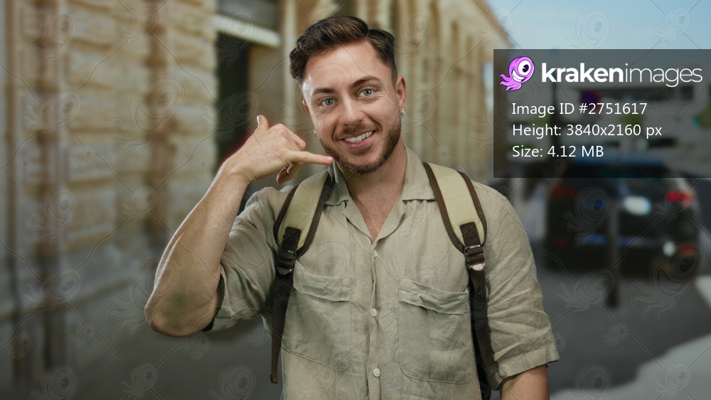 Young bearded tourist man pointing and making a call me gesture on a city street, wearing a casual shirt and backpack, conveying a friendly, approachable vibe. - Kraken Images