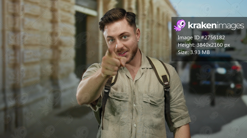 Young bearded tourist man pointing and making a call me gesture on a city street, wearing a casual shirt and backpack, conveying a friendly, approachable vibe. - Kraken Images