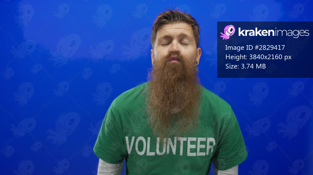 Young bearded volunteer man making finger heart gesture and blowing a kiss in studio; love affection.