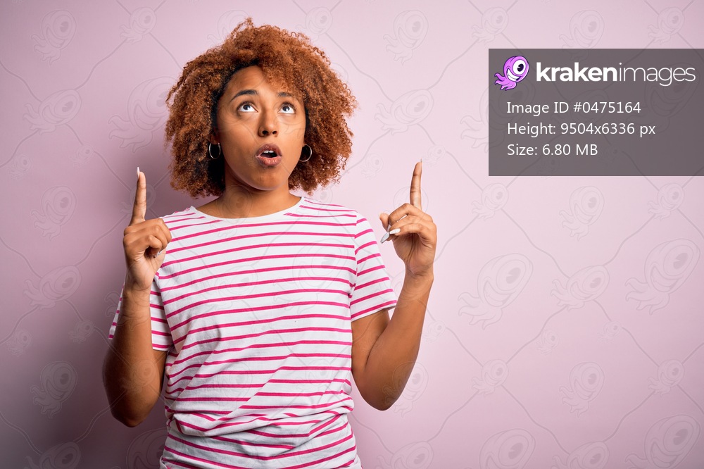 Young beautiful African American afro woman with curly hair wearing casual striped t-shirt amazed and surprised looking up and pointing with fingers and raised arms. - Kraken Images