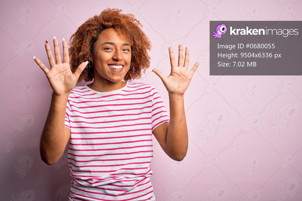 Young beautiful African American afro woman with curly hair wearing casual striped t-shirt showing and pointing up with fingers number ten while smiling confident and happy. - Kraken Images