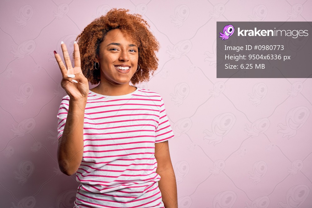 Young beautiful African American afro woman with curly hair wearing casual striped t-shirt showing and pointing up with fingers number three while smiling confident and happy. - Kraken Images