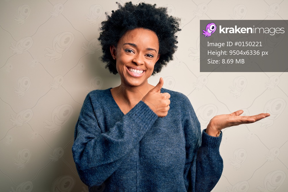 Young beautiful African American afro woman with curly hair wearing casual sweater Showing palm hand and doing ok gesture with thumbs up, smiling happy and cheerful - Kraken Images