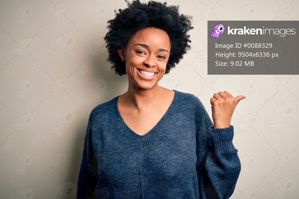 Young beautiful African American afro woman with curly hair wearing casual sweater smiling with happy face looking and pointing to the side with thumb up. - Kraken Images