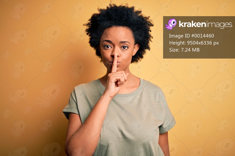 Young beautiful African American afro woman with curly hair wearing casual t-shirt asking to be quiet with finger on lips. Silence and secret concept.