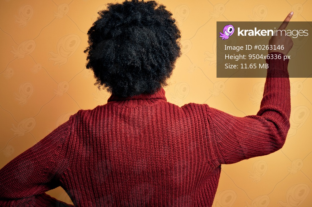 Young beautiful African American afro woman with curly hair wearing casual turtleneck sweater Posing backwards pointing ahead with finger hand