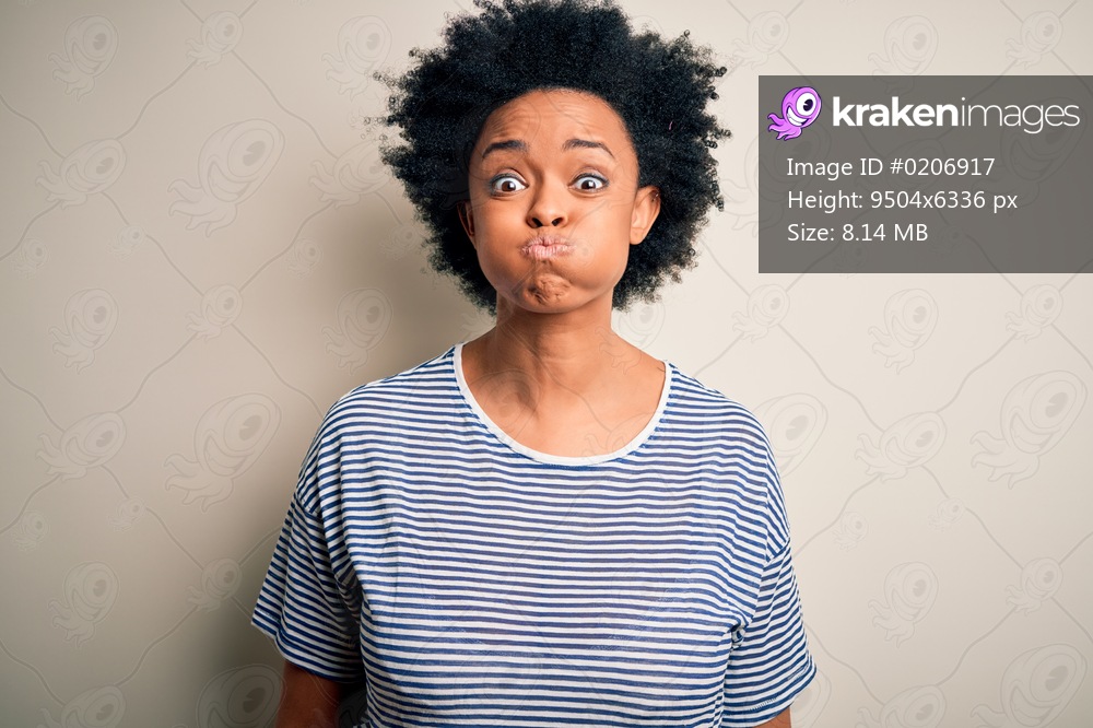 Young beautiful African American afro woman with curly hair wearing striped t-shirt puffing cheeks with funny face. Mouth inflated with air, crazy expression.