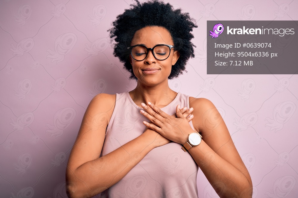 Young beautiful African American afro woman with curly hair wearing t-shirt and glasses smiling with hands on chest with closed eyes and grateful gesture on face. Health concept. - Kraken Images