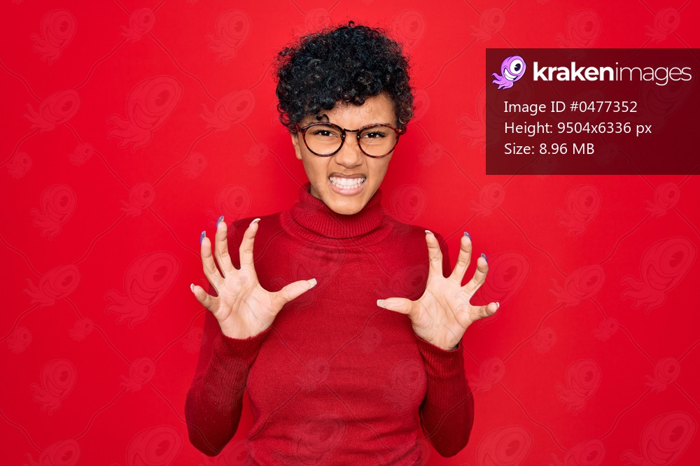Young beautiful african american afro woman wearing turtleneck sweater and glasses smiling funny doing claw gesture as cat, aggressive and sexy expression - Kraken Images