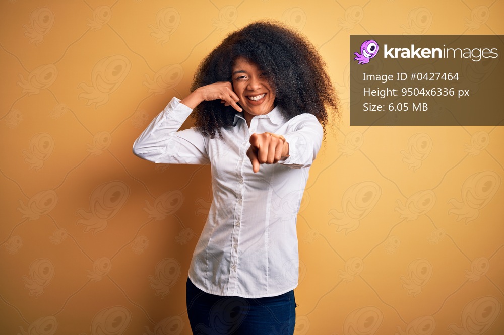 Young beautiful african american elegant woman with afro hair standing over yellow background smiling doing talking on the telephone gesture and pointing to you. Call me. - Kraken Images