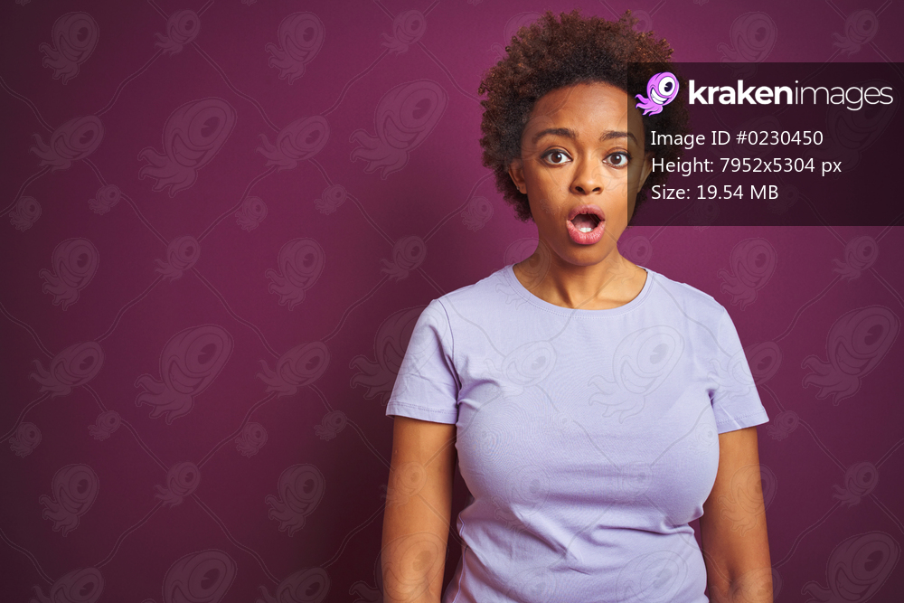 Young beautiful african american woman with afro hair over isolated purple background afraid and shocked with surprise expression, fear and excited face. - Kraken Images