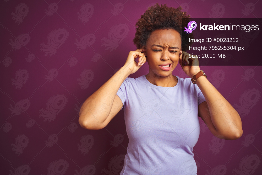 Young beautiful african american woman with afro hair over isolated purple background covering ears with fingers with annoyed expression for the noise of loud music. Deaf concept. - Kraken Images